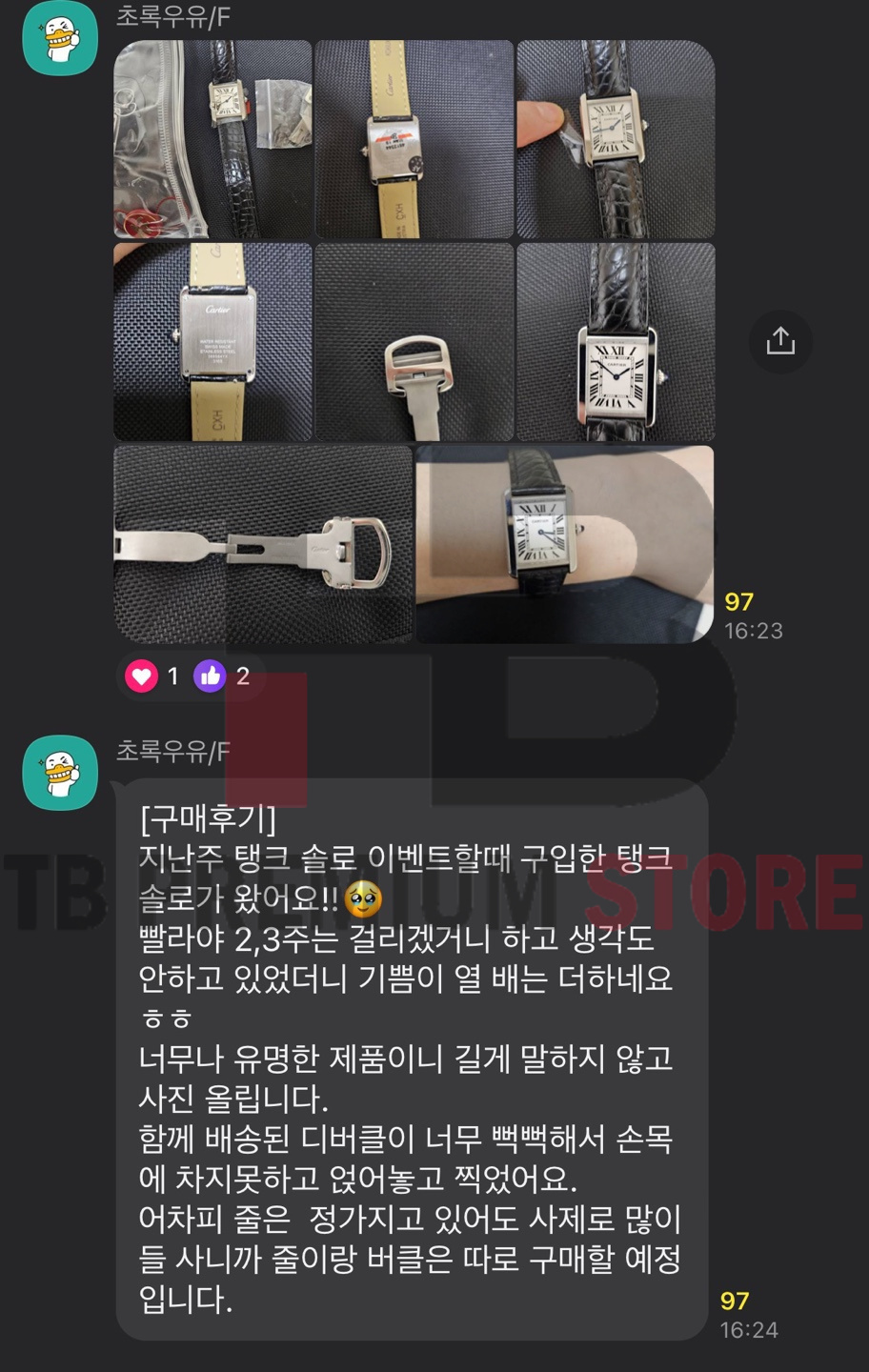 AF공장 까르띠에 탱크솔로 후기 토보샵 0 150 03.20 12:26 제품명 AF공장 까르띠에 탱크솔로 [구매후기] 지난주 탱크 솔로 이벤트할때 구입한 탱크 솔로가 왔어요!! 빨라야 2,3주는 걸리겠거니 하고 생각도 안하고 있었더니 기쁨이 열 배는 더하네요ㅎㅎ너무나 유명한 제품이니 길게 말하지 않고 사진 올립니다. 함께 배송된 디버클이 너무 빡빡해서 손목에 차지못하고 얹어놓고 찍었어요. 어차피 줄은 정 가지고 있어도 사제로 많이들 사니까 줄이랑 버클은 따로 구매할 예정입니다.